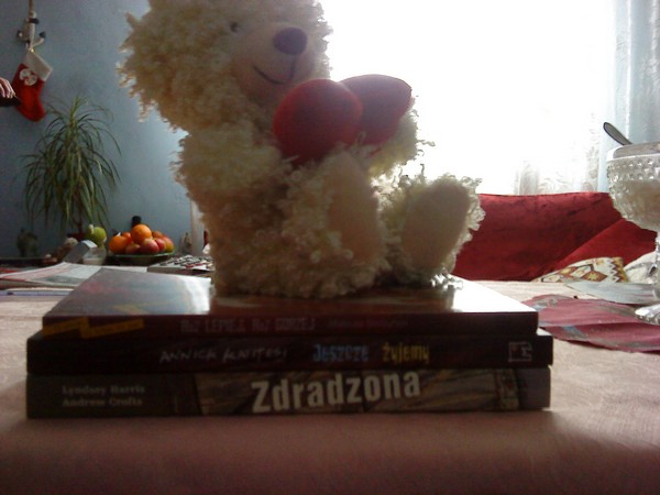 Tadaaaaaam… Przedstawiam swój pierwszy stosik, maskotkę którą dostałam na święta i kawałek swojego pokoju 😀 Bezczelny wszedł mi w kadr 😀 Przepraszam za jakość zdjęcia, ale telefonem robione…