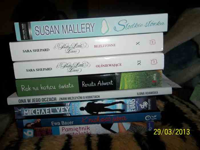 Na pierwszy ogień idą “Słodkie słówka” S. Mallery, jest to wznowienie, ale słyszałam, że książka fajna. Zobaczymy, Zobaczymy… Dwie kolejne to seria Pretty Little Liars S. Shepard czyli “Bezlitosne” i “Olśniewające”, trochę się boje kontynuacji, ale zarazem nie mogę oprzeć się pokusie poznania dalszych losów bohaterów. Mam tylko nadzieję, że autorka nieprzedobrzy. “Roku na końcu świata” R. Adwent miałam początkowo nie czytać, ale skusiły mnie recenzje, no i mam ;). Ta cienka niepozorna, szara książeczka mówi o męskim spojrzeniu na kobiety, “Ona w jego oczach. Znani mężczyźni o kobietach” I. Adamska. Kolejna to całkiem nowa odsłona R. P. Evansa, “Więzień celi 25” zaintrygował mnie nie tylko opisem, ale i tym, że Evans piszę zupełnie o czymś innym niż dotychczas. Przed ostatnia to “Kruchość jutra” E. Bauer, jest to kontynuacja książki “W nadziei na lepsze jutro”, która bardzo mi się podobała. I wreszcie ostatnia aczkolwiek nie najgorsza, i właściwie sprawczyni zmian w moich planach. “Pamiętnik nastolatki 6” B. Andrzejczuk, pochłonęłam ją w kilka godzin i mam wielki niedosyt, za mało! Ja chcę więcej!