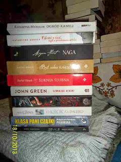 Pierwsza pozycja to niespodzianka od autorki, za którą jeszcze raz bardzo dziękuję. “Ogród Kamili” K. Michalak jest już przeczytany i zrecenzowany, kto nie czytał, a miałby taką ochotę – wystarczy kliknąć. Kolejna pozycja to “Faceci z sieci” K. Gubała – zaintrygowała mnie i zaraz po przeczytaniu tego co mam porozpoczynane się za nią zabieram. Zobaczymy czy się nie zawiodę. Z kolei “Naga” M. Hart wybrał am sobie dla relaksu i pobujaniu w obłokach (chyba…), a co. 😛 Kolejne dwie “Był sobie książę” i “Suknia ślubna” R. Hauck zobaczyłam u kogoś na blogu, poczytałam o nich no i mam. 😉 Na “Szukając Alaski” J. Greena czekałam długo, ale się wreszcie doczekałam. Będzie czytana po “Faceci….”, bo to jedna z tych pozycji, które muszę po prostu przeczytać jak najszybciej. “Tancerze burzy” J. Kristoff to pierwsza pozycja nowego wydawnictwa, która u mnie zagościła. Ponieważ to mój zakup, trochę poczeka na swoją kolej, ale mam nadzieję, że trafiłam doborem. Na “O krok za daleko” A. Glines skusiłam się, bo Izuś się podobała, no i dlatego, że MUSZĘ przeczytać część drugą – ach te noty wydawców! Ostatnie dwie książki są pożyczone od Agusi mojej kochanej (jeszcze raz dziękuję!;*). “Klasa pani Czajki” M. K. Piekarska, Aguś tak ją zachwalała to się pokusiłam. 😉 “Magia i miłość” M. Dąbkowskiej miałam w planach, ale nie była moim priorytetem, ale skoro była okazja 😉