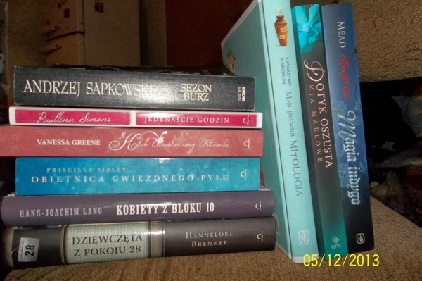 Zacznę od tych leżących. I tak, pierwsza to “Sezon burz” Andrzeja Sapkowskiego, pożyczona od przyjaciółki, zobaczymy czy mi się spodoba twórczość tego pisarza. Ta mała różowa to jeden z dubli, “Jedenaście godzin” Paulliny Simons, którą pewnie zacznę po weekendzie czytać. Kolejna to upragniony “Klub Porcelanowej Filiżanki” Vanessy Greene, idealna na świąteczny, mam nadzieję, czas. Następna upragniona, trochę pod wpływem Mooly, “Obietnica gwiezdnego pyłu” Princille Nibley, cóż – opis kusił, Mooly kusiła 😉 Kolejne dwie poruszają temat II wojny światowej, a po przeczytaniu “To, co zostało” J. Picoult poczułam potrzebę sięgnięcia po coś poruszającego tematy z tamtego okresu. I tak w moje łapki trafiły dwie książki – “Kobiety z bloku 10: Eksperymenty medyczne w Auschwitz” Hans Joachim Lang , “Dziewczęta z pokoju 28” Hannelore Brenner – poruszające losy kobiet w tamtym okresie. Już zacieram rączki na myśl o ich lekturze. Z tych stojących najbardziej zadowolona jestem z “Moja pierwsza mitologia” Katarzyny Marciniak – cudo, pięknie wydane, świetne ilustracje, twarda oprawa. No zakochałam się w niej 😉 Ten zielony grzbiet to “Dotyk oszusta” Mii Marlowe, bo nie lubię porzucać rozpoczętych serii… No i najnowsza z serii “Magia indygo” Richelle Mead, musiałam mieć 😀