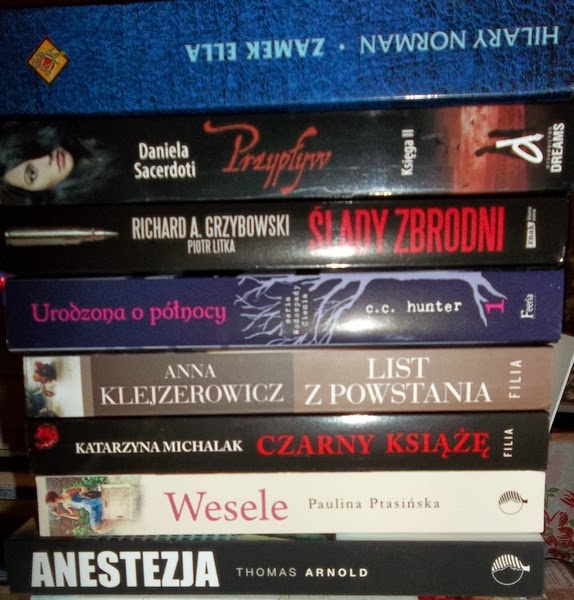“Zamek Ella” Hilary Norman został mi polecony, nigdy dotąd o tej książce nie słyszałam, ale w trakcie czytania jednej książki była o niej wzmianka, a następnie rozmowa i słowa “musisz przeczytać” – no skoro tak to kupiłam ;). “Przypływ” Danieli Sacerdoti to kontynuacja “Wizji”, które bardzo mi się podobały i nie mogę doczekać się już dalszych wydarzeń. “Ślady zbrodni” Richarda A. Grzybowskiego wzięłam bardziej ze względu na brata, ale sama również ją przeczytam 😉 Może być ciekawa lektura. Na “Urodzoną o północy” C. C. Hunter ostrze ząbki od ukazania się jej zapowiedzi. Ciekawe czy okaże się być taka dobra, jak piszą. “Liist z Powstania” Anny Klejzerowicz to niespodzianka od wydawnictwa, ale jakże miła! Na dniach możecie spodziewać się jej recenzji. Co do “Czarnego Księcia” Katarzyny Michalak, to chyba jestem masochistką, ale ciekawi mnie czy coś w pisaniu erotyków przez Michalak się zmieniło. A “Wesele” Pauliny Ptasińskiej zaciekawiło mnie opisem, o to zobaczymy z czym to się je 😉 No i ostatnia, “Anestezja” Tomasza Arnolda trochę pomyłka, ale opis zapowiada ciekawą fabułę to przeczytam. 😉