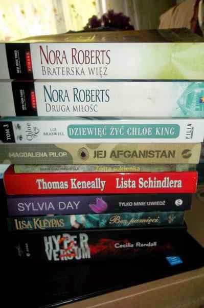 “Braterska więź” oraz “Druga miłość” Nory Roberts to pozycje dla mamy Bujaczka, chociaż Bujaczek nie przeczy, że i ona sama do nich zaglądnie, bo lubi twórczość tej pisarki. Kolejna książka to “Wybrana” Liz Braswell, trzeci i ostatni tom serii Dziewięć żyć Chloe King. Hm, wypadałoby zapoznać się teraz z tomem drugim ;). “Jej Afganistan” Magdaleny Pilor  to publikacja dość nietypowa jak dla Bujaczka, ale informacje znalezione na jej temat w internecie zaciekawiły Bujaczka. “Żółta sukienka” Beaty Gołembiowskiej wygląda na niepozorną książeczkę, ale blurb zapowiada powieść pełną emocji oraz wrażeń. “Lista Schindlera” Thomasa Keneally to pożyczka od przyjaciółki/siostry/mamy nr 2 (hm, Bujaczek sama się już w tym pogubiła :D). Temat II wojny światowej, trudny, bolesny, ale nie tak bolesny dla nas jak dla tych co przetrwali te czasy. No ok, ok. Znowu Sylvia Day, tym razem “Tylko mnie poproś”. Bujaczek ma do niej słabość i nic na to nie pocznie, przypadek nieuleczalny. “Bez pamięci” Lisy Kleypas to kredyt zaufania dla autorki. Bujaczkowi podoba się trylogia o zatoce Friday tejże autorki i słyszała, że pisze fajne romanse historyczne oby tak było… 😉 No i ostatnia, wyczekiwana dwa lata (!) kontynuacja Hyperversum Cecilii Randall “Sokół i lew”, to jest pozycja na majówkę, Bujaczkowi już leci ślinka na myśl o niej…mniam!