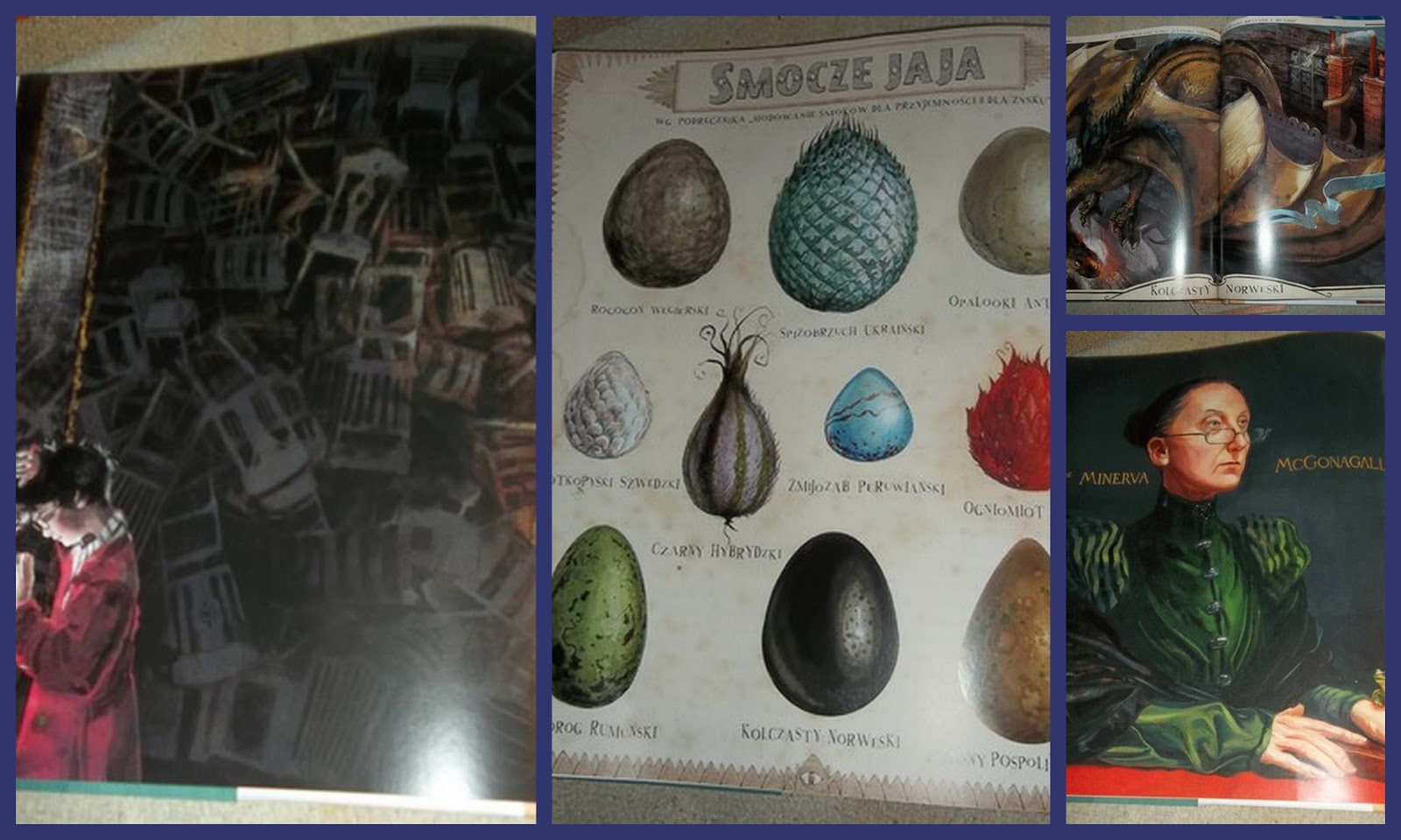 jest ilustracja z Hodowanie smoków dla przyjemności i dla zysku przedstawiająca zbiór wszystkich smoczych jaj czy też Przewodnik po trollach według Newta Scamandera.