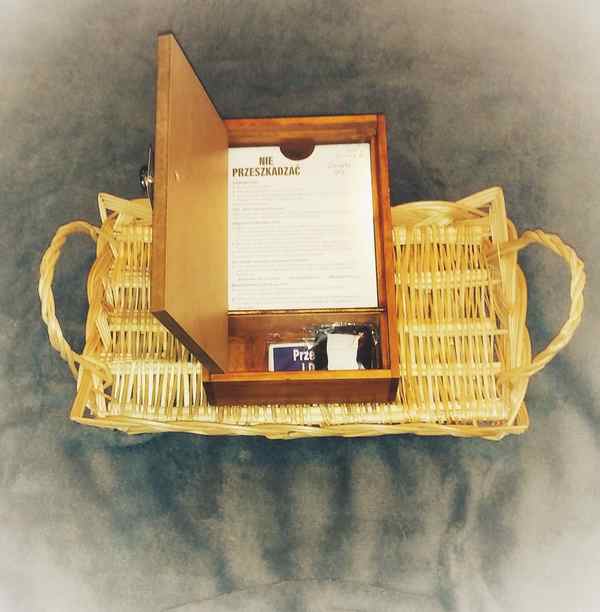 Gra ma kształt drewnianej skrzyneczki (będącej pokojem) z hotelowym drzwiami, na których wisi zawieszka z napisem NIE PRZESZKADZAĆ. Nie jest zbyt duża, ale trochę waży. W środku znajdują się dwie przegródki, ale pomimo tego wszystko się w niej idealnie mieści. Trzeba jednak uważać na karty z obrazkami, ponieważ łatwo je pogiąć.