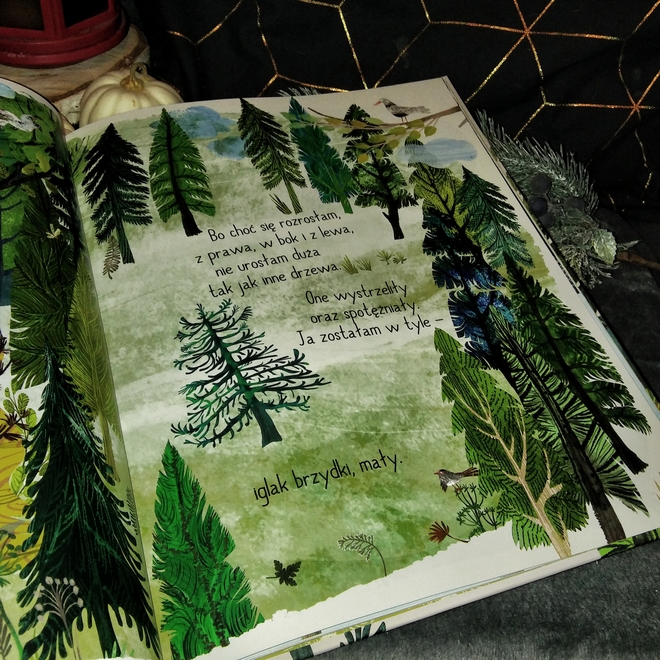 Pierwsze, na co zawsze zwracamy uwagę, to oczywiście szata graficzna. I jest ona cudowna. Takie okładki zawsze najbardziej mnie przekonują. Proste, przedstawiające główny temat historii. Yuval Zommer, który jest i autorem i ilustratorem naprawdę się postarał. Przeglądając książkę naprawdę można poczuć się, jak w lesie. Jest zielono, otaczają nas drzewa, szumi wiatr i śpiewają ptaki. No coś pięknego. Wszystko jakby namalowane farbkami idealnie współgra z tekstem i jest jego uzupełnieniem. Tutaj losy jodełki poznajemy nie tylko poprzez tekst, ale i ilustracje. Warto również dodać, że samej treści nie jest aż tak dużo. Na stronach znajduje się tekst od jednego słowa, aż do raptem kilku linijek. Napisane wierszem, ale prostym językiem.