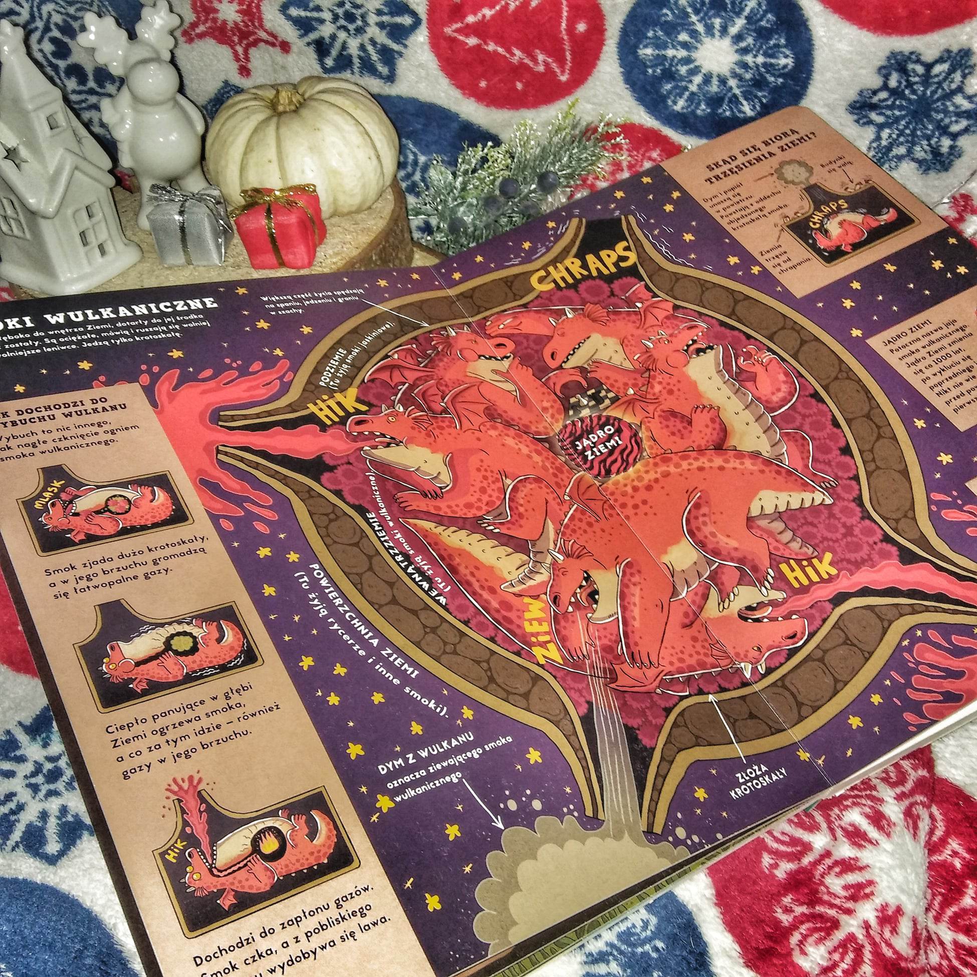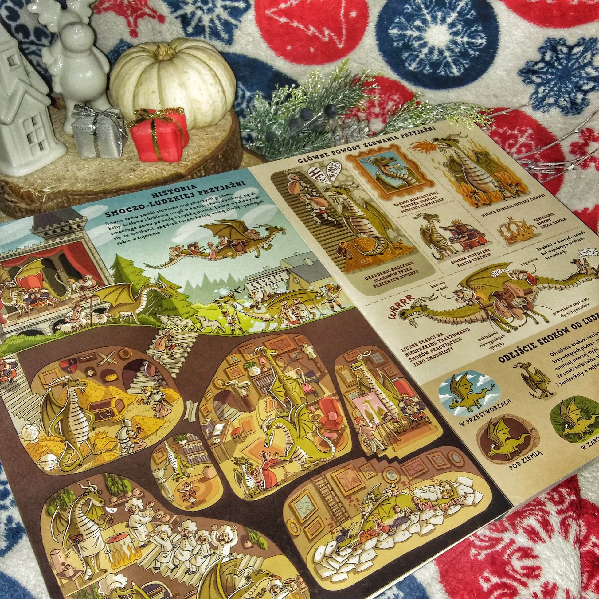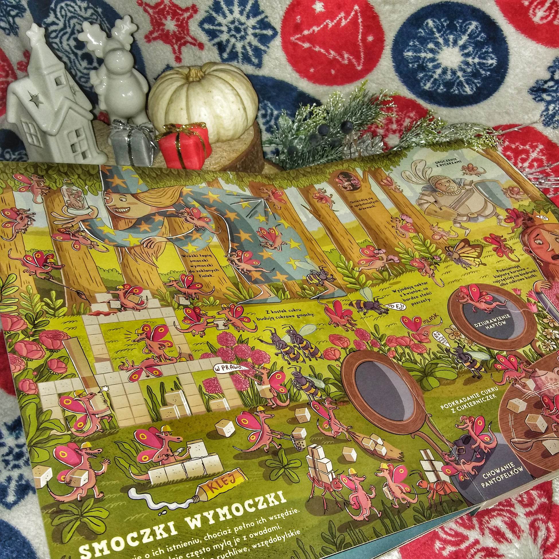 Bez wątpienia to warstwa ilustratorska robi tutaj ogromne wrażenie. Nikola Kucharska tworzy przepiękne rozkładówki, na których dzieje się tak dużo, że łatwo stracić poczucie czasu na zaledwie jednej. Przepiękne kolory, duża szczegółowość i ogrom elementów. Pomaga to wyjaśnić i zrozumieć wszystko. Prace ilustratorki są zabawne, urocze i cechują się kreatywnością. Każdy smok jest inny i wyjątkowy.
