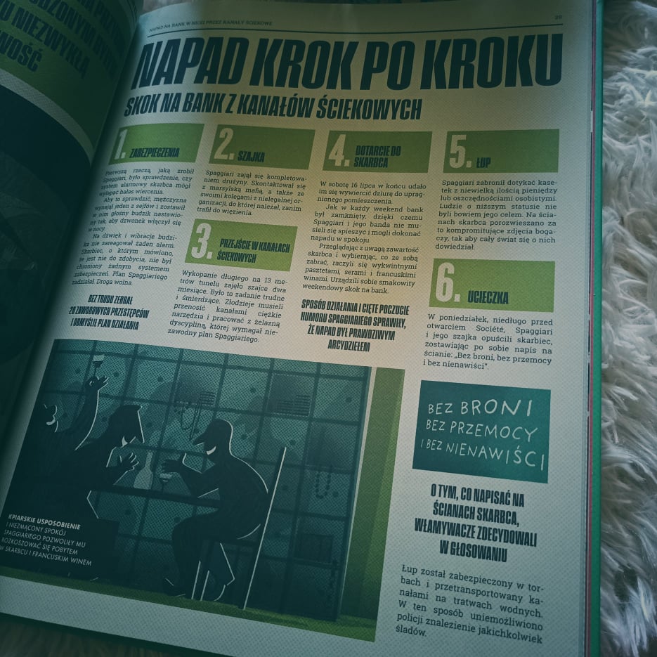 Legendarne kradzieże to zaledwie 64 strony. Treści jest tutaj naprawdę niewiele, wszak ma to wyglądać jak artykuł w gazecie. Jednak pomimo tego, autor przedstawia najważniejsze fakty i ciekawostki związane ze sprawami. Każda z rozkładówek została naprawdę dopracowana i dzięki temu wszystko jest czytelne. Czytając, ma się wręcz wrażenie śledzenia informacji o danym złodzieju. Napisane tak, by intrygować, czasem daje pstryczka okradzionym, by pozbawić ich zbytniej pewności siebie. Plusem jest również to, że poznajemy tu historię już nam znane ze słyszenia oraz też takie, o których czytamy pierwszy raz. Od włamania do muzeum, przez podkopy, aż do hakerstwa. No jest co poznawać.