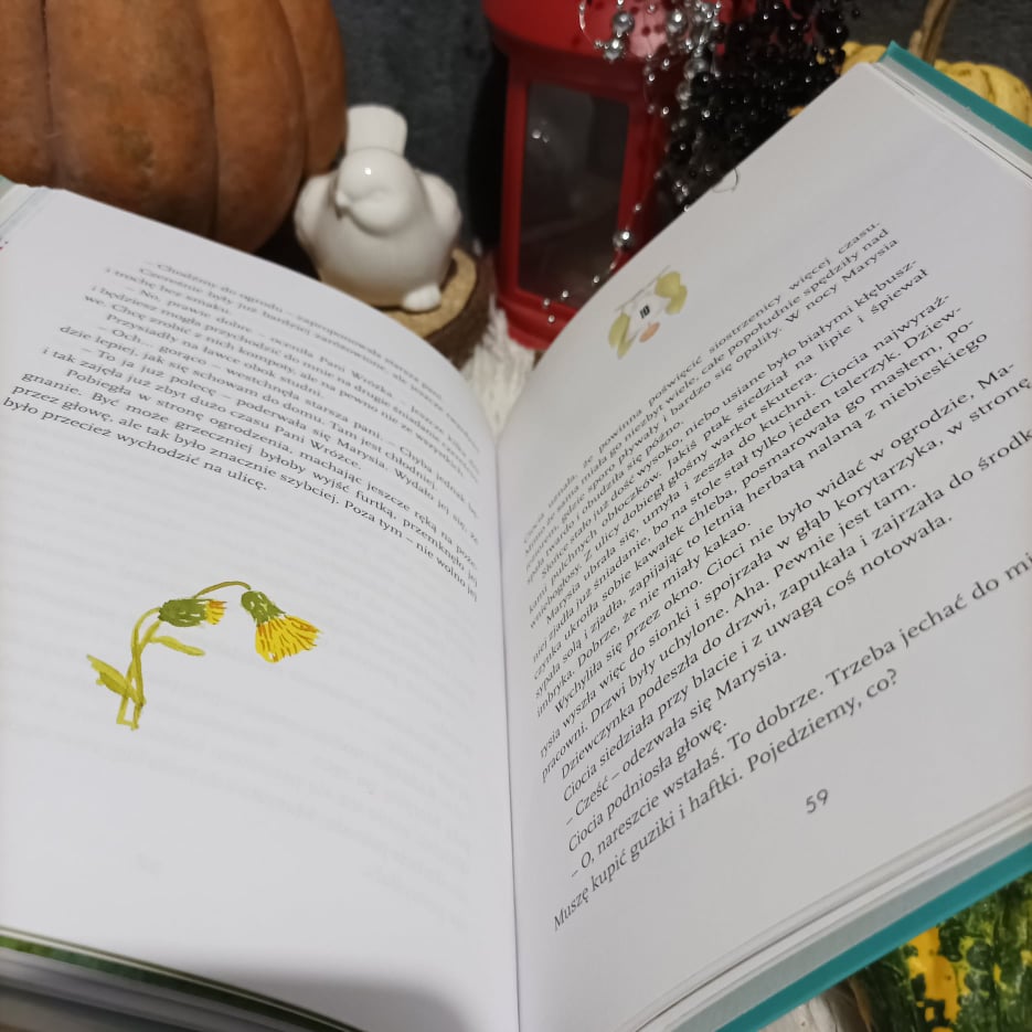 Może nieznacznie, ale HarperKids zmienił nieco okładkę. Na froncie nadal widać Marysię, ale reszta już się różni. Sama okładka jest na pół sztywną. I to chyba koniec zmian, bo w środku nadal znajdują się ilustracje Małgorzaty Musierowicz. W dalszym ciągu zachwycają one klimatem jak z dawnych bajek. Artystka zadbała o to, by wszystko na nich żyło, było kolorowe i pełne emocji. Ich atutem jest to, że niezależnie od wieku czytelnika przyciągają wzrok. Co do samej treści Emilia Kiereś poprzez historię Marysi pokazuje, że zmiany są częścią naszego życia. I chociaż budzą strach oraz lęk przed nieznanym, to nie trzeba się ich bać. Bo owszem musimy odnaleźć się w nowej rzeczywistości i sami wykazać odrobinę starań, ale to może zapoczątkować coś naprawdę miłego. Dużym plusem jest to, że ten jakże ważny przekaz jest wpleciony w historię pełną przygód, pięknych zapachów, smakowitych potraw, śmiechu i budowania pewności siebie.