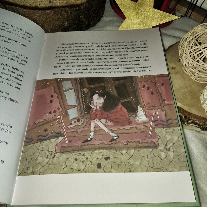 Nie mogę też zapomnieć o charakterystyce postaci. Część z nich jest nam znana, ale tutaj poznajemy je z zupełnie innej strony. Jaś i Małgosia znają Babę Jagę i ja bardzo lubią, wilk co prawda zjada Czerwonego Kapturka, ale nie jest taki zły i nawet tych dwoje się lubi. Podobało mi się takie spojrzenie na ich życie od innej strony. Jednak dużo ciekawsze były postacie z niedokończonych bajek. Wzbudzają sympatię i chęć pomocy im. Są uroczy i aż żal serce ściska, że ich historie nie zostały dokończone.