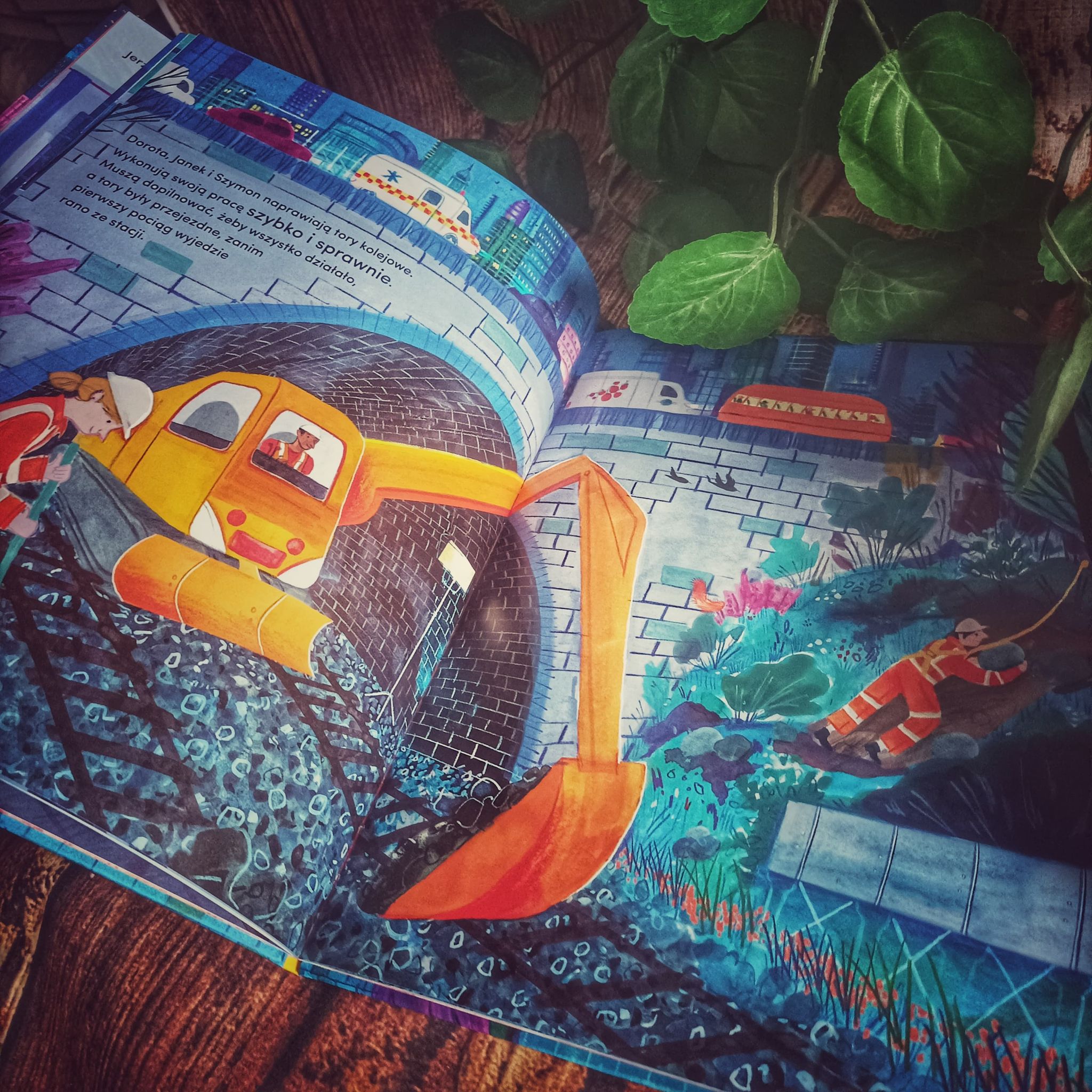 Chociaż Gdy zapadnie noc nie ma zbyt wiele stron, to trzeba przyznać, że skrywa w sobie mnóstwo informacji. Dla mnie to bardziej picturebook niż zwykła książka, bo jednak główną rolę odgrywają tutaj ilustracje. Treść jednak też jest ważna, zadbano, by była łatwa do odczytania i zrozumienia. Autorka wspomina o wielu zawodach wykonywanych nocą. To wtedy najlepiej sprząta się biura, rozpakowuje towar, dziennikarze dbają, by nie umknęła nam żadna wiadomość ze świata, a muzycy umilają wieczory swoim widzom. Piekarnie dbają, by rano w sklepach było świeże pieczywo, a pracownicy stacji paliw zapewniają paliwo. Dużo się dzieje na każdej z rozkładówek. A co najważniejsze książeczka pokazuje, ile ważnych i przydatnych zawodów wykonuje się nie tylko w dzień. I takie, które najlepiej wykonywać tylko w nocy