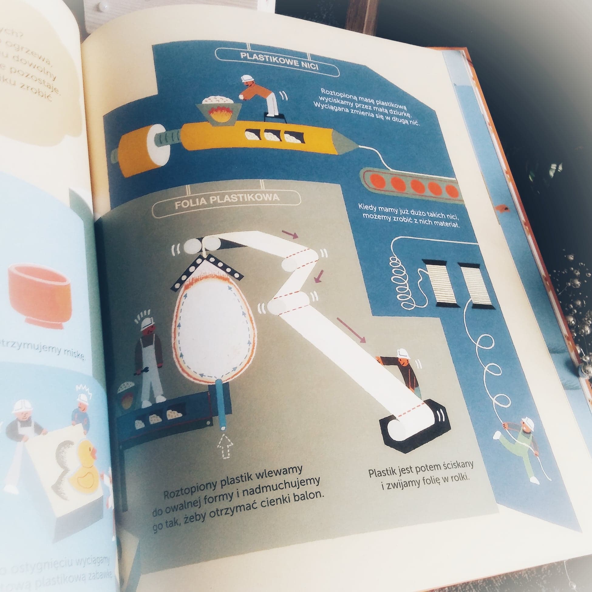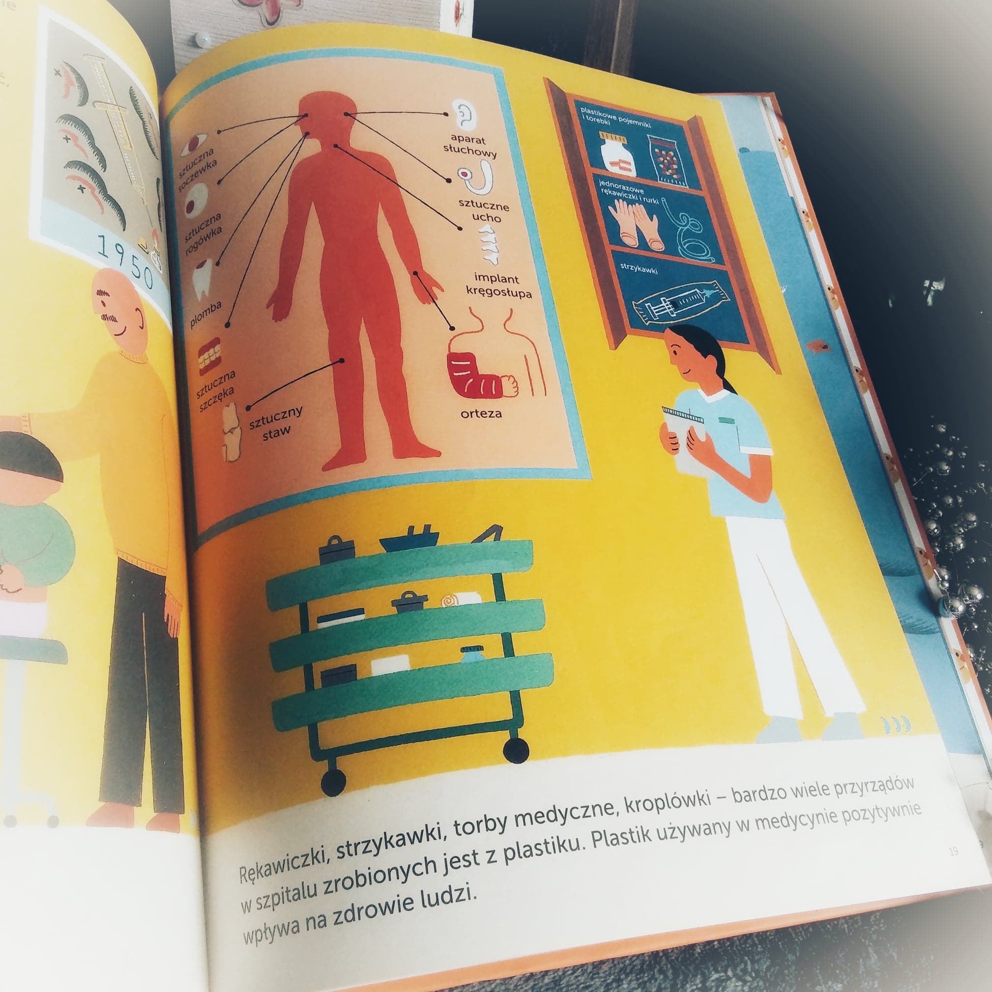 Eun-Ju Kim na ponad 30 stronach umieściła naprawdę dużo faktów oraz ciekawostek na temat opisywanego tworzywa. Plastik fantastik? uświadamia nas, ile rzeczy jest z niego zrobionych i jak często się nim otaczamy. Obecnie ludzie używają około 300 ton plastiku rocznie, podoba nam się to, że jest wydajny, trwały, łatwo dostępny i prosty do wyprodukowania. To zaledwie mała część tego, czego możemy dowiedzieć się o bohaterze tej książki, wiedza w niej zawarta została dostosowana do wieku odbiorcy, ale nie jest koloryzowana. Autorka w przystępny sposób podaje fakty, wspomina, kiedy powstał, czym tak naprawdę jest plastik, co się z niego produkuje. Wspomina o jego przydatności, ale również szkodliwości.