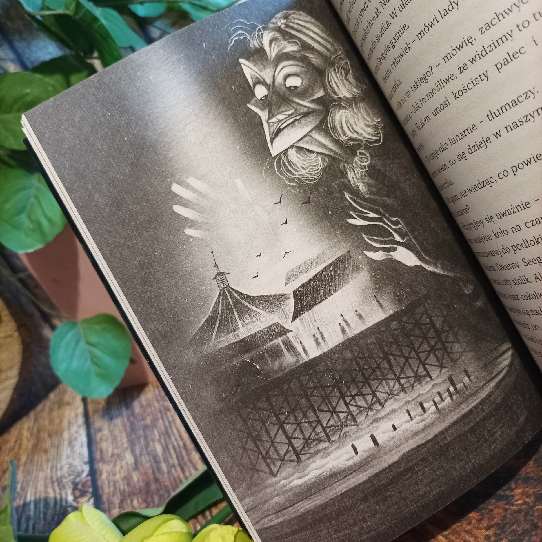 Muszę przyznać, że chociaż czarno białe, to bardzo podobają mi się ilustracje Toma Bootha. Artysta ma przyjemną kreskę. Prace są niezwykle dokładne i szczegółowe. Na twarzach widać emocje, fajne jest to, że wszystko jest inne i tak dobrze uzupełnia się z treścią. Ilustrator nadał rysunkom życia, tchnął w nie magię i sprawił, że oczami wyobraźni łatwo było ujrzeć wszystko, o czym się czyta.