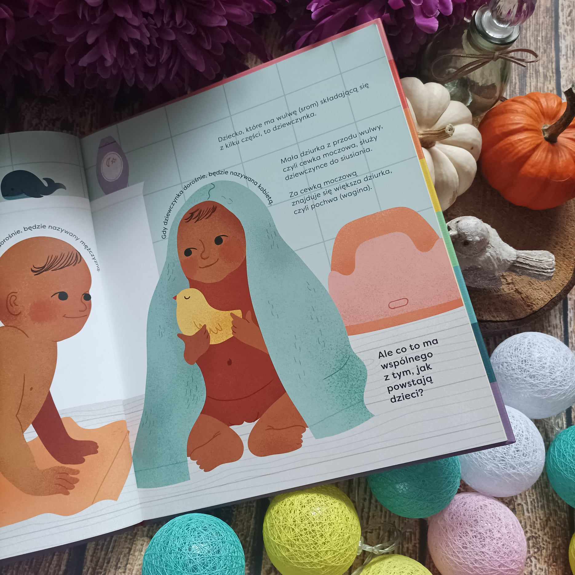 W jakimś stopniu dzieci wiedzą, jak wyglądają i co je różni. Jednak to za mało i przychodzi moment, gdy chcą też poznać inne fakty dotyczące nich samych. Skąd się biorą, przynosi je bocian, znajduje się je w kapuście, a może są poczęte z miłości? Pragną poznać fakty o różnicach między nimi, ale oprócz tego w przystępny sposób prawdopodobnie po raz pierwszy usłyszą o budowie plemnika i komórki jajowej oraz opisie rozwoju płodu. A to tylko garstka tego, co znajdziemy w środku.