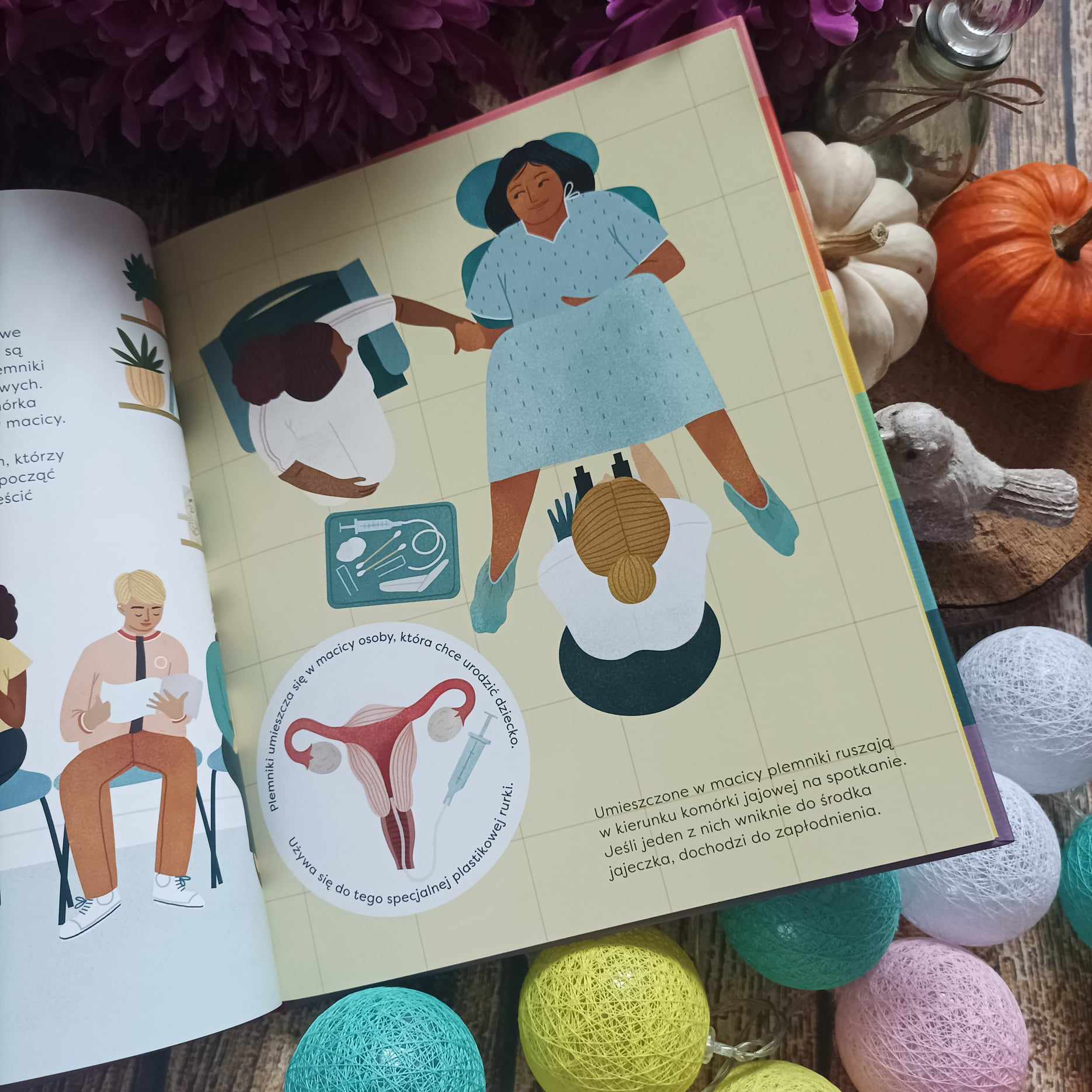 To samo mogę powiedzieć o Rachel Greener, która prosto, ciekawie, ale i czule opisuje wszystko od momentu poczęcia do narodzin. Nazywa nazwami własnymi, nie używa dziwnych pojęć. Co jeszcze lepsze, pokazuje, że dziecko może powstać na kilka sposobów, ale ważne jest tak samo. W lekkim czasem nawet humorystycznym stylu pisze, że dzieci w domu pojawiają się w sposób naturalny, za pomocą in vitro, a także poprzez adopcję. Że może je różnic nie tylko płeć, kolor skóry, oczu czy włosów, ale wiele innych rzeczy. I to wszystko na zaledwie 32 stronach przy niewielkiej ilości tekstu.