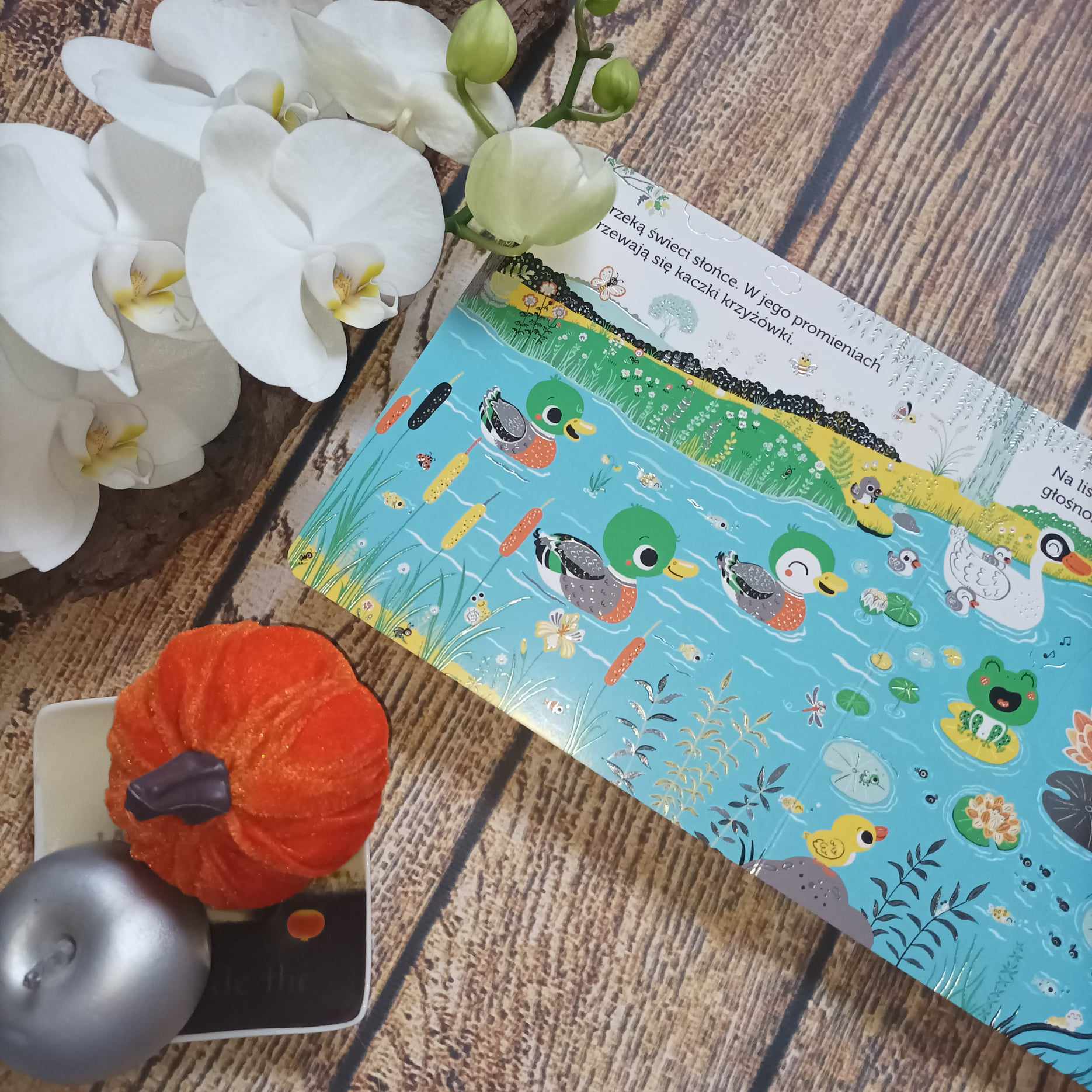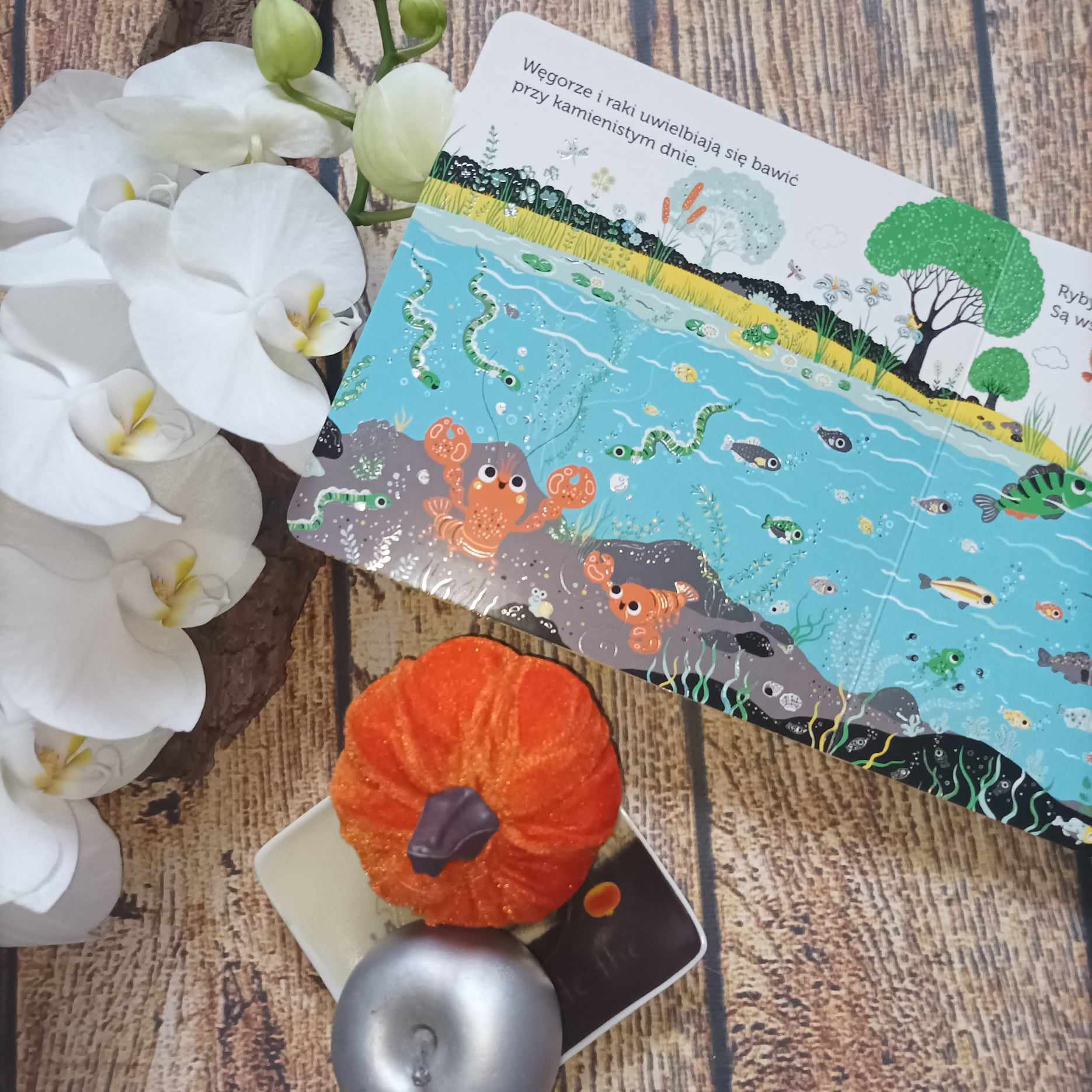 Wyruszając nad rzekę, czy też staw możemy cieszyć się nie tylko ich uspokajającymi dźwiękami, czy też pięknymi widokami. Blisko nich mieszka wiele wodnych zwierząt, ptaków, a nawet przyjrzeć się roślinności. W tej książeczce odkryć można między innymi, jakie ryby pływają w rzece, kto się chowa za trzcina, czy też ile żabek obecnie siedzi na liściach lilii.