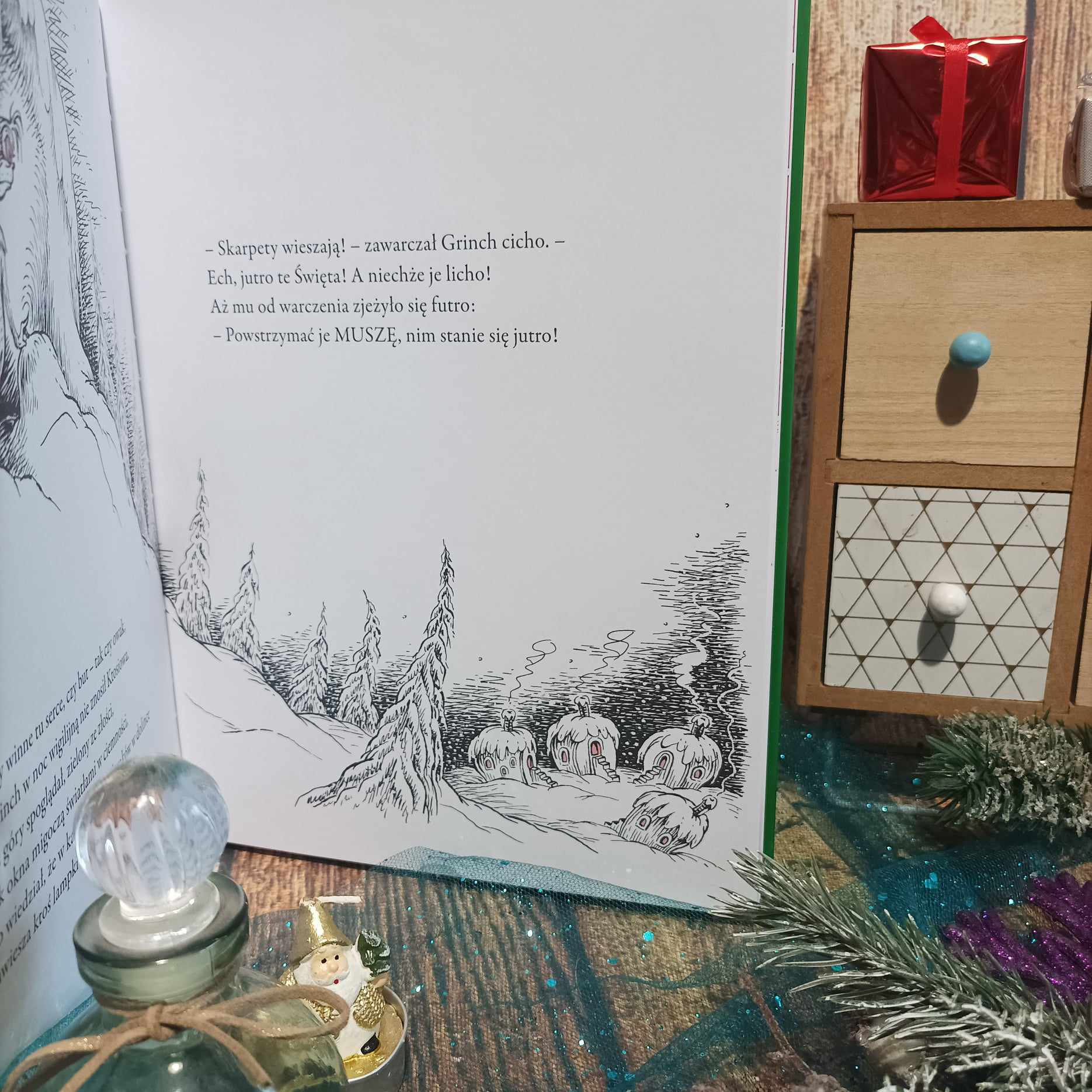 Trzeba przyznać, że Theodor Seuss Geisel swoimi ilustracjami stanowi dużą odmianę od tych słodkich i kolorowych w świątecznych tytułach. A jednak te czarno białe prace z przełamaniem czerwieni mają w sobie coś takiego, co zwraca uwagę czytelnika w każdym wieku. Kreska trochę komiksowa, ale co najbardziej zwraca uwagę, to sam Grinch, będący słodko-wrednym stworzeniem. Mina wskazuje, że knuje/robi coś niezwykle złego, ale przy tym jest… uroczy.