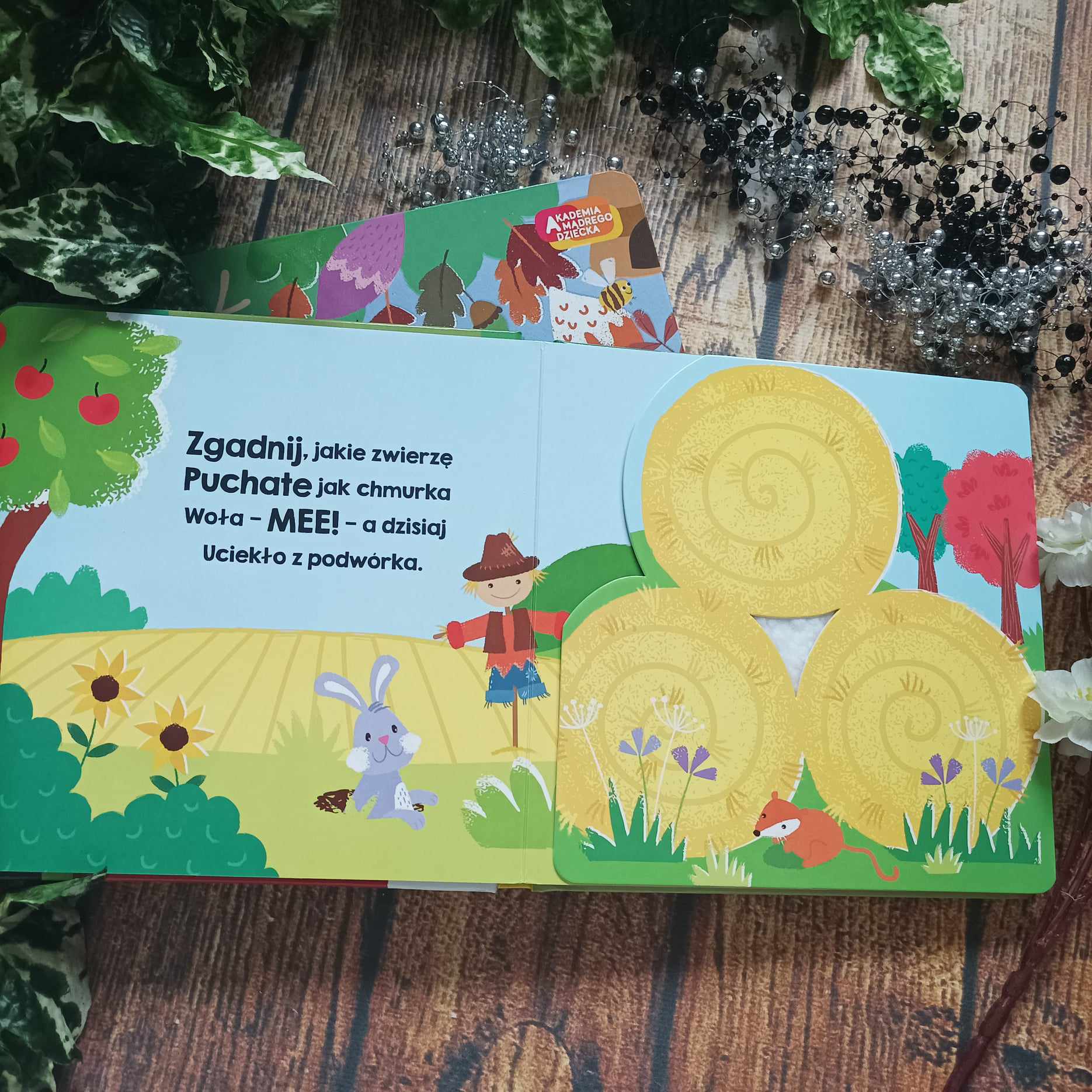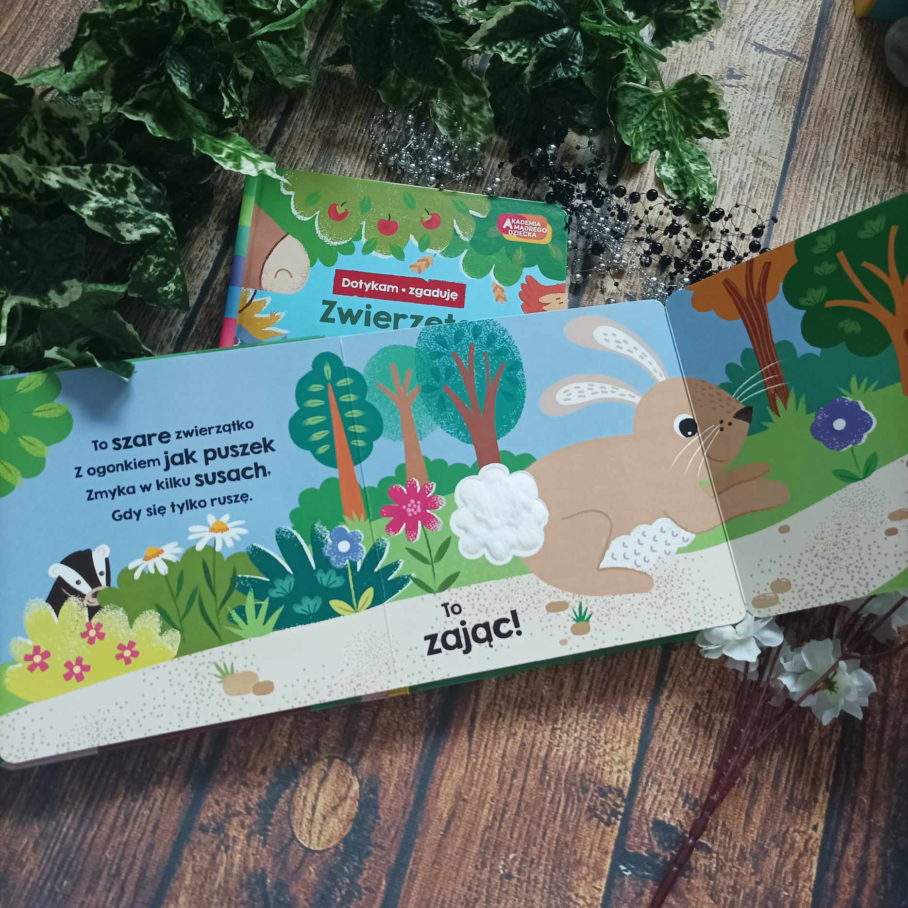 Dotykam – zgaduje to nowa seria wchodząca w skład Akademii Mądrego Dziecka. Na dobry początek powstały dwa tytuły – Zwierzęta na wsi oraz Zwierzęta w lesie. Na każdej rozkładówce jest parę zdań i zwierzęta do odkrycia skrywające się za ruchomą klapką. Zanim za nią zajrzymy, by poznać kaczkę, krowę, zająca czy sowę możemy pogłaskać przez tę klapkę fragment danego zwierzątka i przekonać się, czy ma futerko, jest gładkie, a może chropowate.